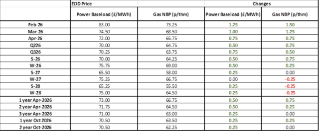On Friday wholesale Gas and Electricity prices rose in the near term but were relatively static beyond April 2026 with very minor increases across the board in that period.