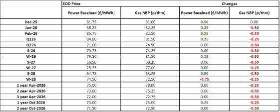 Gas: Most NBP prices fell during yesterday’s session. Above seasonal norm temperatures pressure demand, although forecasts yesterday show temperatures falling as we enter December. Early trading this morning is down on last nights close.