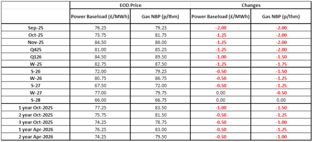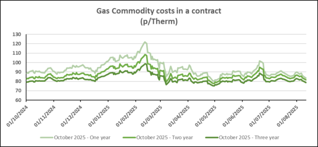 To put that into context, one-year electricity prices are now comfortably below £80 per MWh, and gas is approaching that level at £83.50 per therm. That said, the curves are very flat, with a range of less than 5% between one-, two-, and three-year deals.