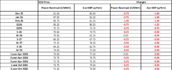 Gas: Gas prices fell yesterday as stable domestic consumption capped impact in the prompt, as temperatures continue to remain above average for this time of year. Forecasts of a potential cold snap in the next fortnight limited prices from falling further.