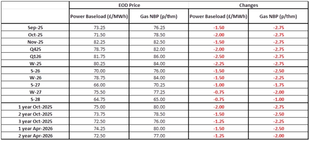 | Gas: Gas prices fell at the conclusion of last week. Domestic demand fell below seasonal average in the prompt. In the curve, British and European storage levels continue to climb, easing the risk premiums on curve products. The UK expects to receive two LNG cargoes by the end of the week, further increasing storage injections. Power: Power prices continued to track the gas market at the end of last week and fell alongside. Despite below-seasonal average wind generation, prices still fell as demand also fell. Further out, power contracts softened as they tracked the losses in the carbon market. Oil: Oil prices fell last Friday as traders awaited talks between the US and Russia about ending the war in Ukraine. Any agreement would see the easing of sanctions on Russia. Carbon (EU ETS): The ICE Dec-25 fell to €70.68/t at the end of last week. The contract opened at €70.72/t this morning and is currently trading at €70.58/t. Carbon (UKAs): The ICE Dec-25 fell to £50.80/t on Friday. The contract opened at £52.43/t and is trading back at £50.80/t at the time of writing. |