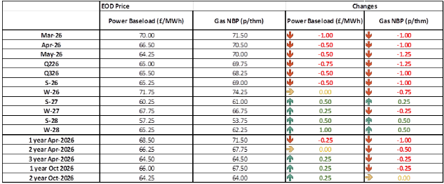 Gas: Gas prices fell yesterday. In the prompt temperatures and wind generation were both expected to rise in week 9, leading to less demand for gas-fired power. The curve continued to fall, tracking bearish weather fundamentals and geopolitics.