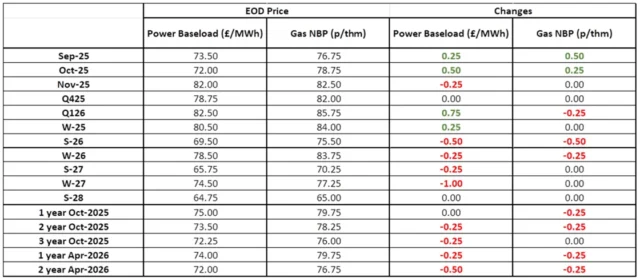| Gas: NBP prices were mixed yesterday. Declines in demand, below average wind generation and an unplanned outage at the Norwegian Troll facility helped create challenging market conditions. Power: Power prices fluctuated yesterday. Downwards revisions to wind forecasts influenced prompt pricing. Season ahead prices were supported by the benchmark UKA Dec25 contract. Out on the curve prices largely followed NBP. Oil: Prices settled slightly up yesterday following the US president’s meeting with the Ukrainian PM. The front month is currently trading c.$66/bbl. Carbon (EU ETS): The ICE Dec-25 closed at €71.82/t yesterday. The contract opened at €71.77/t this morning and is currently trading at €72/t. Carbon (UKAs): The ICE Dec-25 rose to £51.08/t yesterday. The contract opened at £51.38/t and is trading back at £51.13/t at the time of writing. |