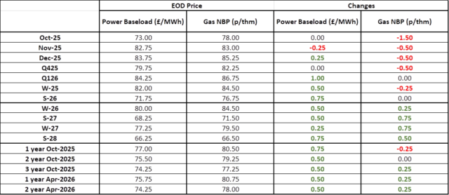Carbon (EU ETS): The ICE Dec-25 closed at €72.99/t last Friday. The contract opened at €72.88/t this morning and is trading at €73.80/t at time of writing.