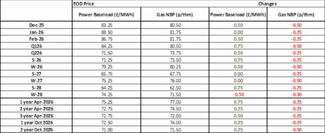 | Gas: Gas prices fell yesterday. Medium range storage at 88% is supporting grid balance during the cold snap. The UK expects to receive six LNG cargoes expected by the end of November, supporting send out. Curve prices continued to fall with the hope of a peace negotiation between Ukraine and Russia. . Power: Power prices decoupled from the gas curve yesterday and rose. In the prompt, wind generation fell to 7.4GWs/day, well below seasonal average. Gains in the carbon market influenced curve prices. Oil: Oil prices fell yesterday as President Trump continued to push for a peace agreement between Ukraine and Russia to end the three-year war. However, a larger than expected draw on U.S crude supplies limited further declines. Carbon (EU ETS): The ICE Dec-25 closed at €81.36/t yesterday. The contract opened today at €80.57/t. Carbon (UKAs): The ICE Dec-25 finished yesterday rising to £58.23/t and opened this morning at £57.50/t |