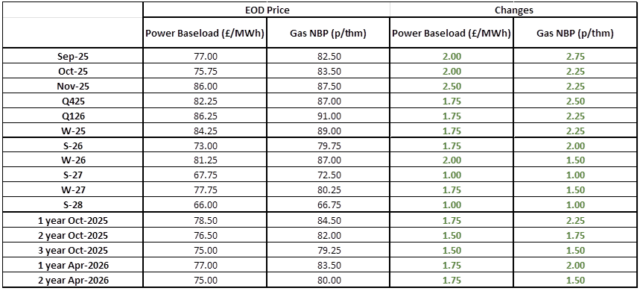 | Gas: Gas prices rose yesterday. A lack of renewable generation in the prompt lead to an increased demand for gas fired output. A low pressure system is expected to bring rain to parts of Europe. Unseasonably cool temperatures were forecasted in Norway leading to an increase demand across other markets, driving prices higher. Power: Power prices increased yesterday. A low renewable output of 2.4GWs for wind and 3.1GWs for solar, supported the gains. The power curve continued to rise, tracking the strengthening wider energy complex. Oil: Oil prices rose by 1% yesterday as the peace negotiations between Ukraine and Russia stalled, ensuring the sanctions on Russian oil remained. U.S data showed strong demand for oil, further feeding into the prices. Carbon (EU ETS): The ICE Dec-25 rose to €72.62/t yesterday. The contract opened at €72.61/t this morning and continues to trade back at this level after €72.35/t earlier in the session. Carbon (UKAs): The ICE Dec-25 jumped up to £52.05/t yesterday. The contract opened at £52.64/t this morning and is currently trading at £52.27/t. |