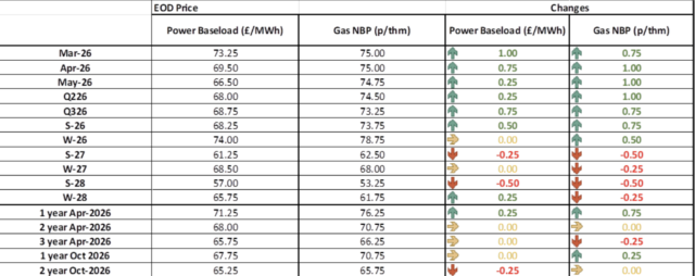 On Wednesday wholesale gas and electricity prices rose across most 2026 contracts, particularly in the near term, likely reflecting short-term supply or demand pressures, while longer-dated contracts were more mixed, suggesting little change to the longer-term outlook.