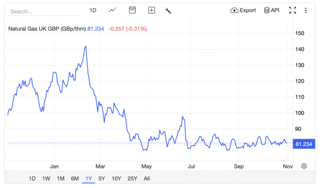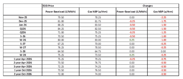 Wholesale electricity prices were static on Thursday, while gas dropped markedly. The one-year prices remain below the psychological markers of £80 per MWh and 80p per therm for gas.