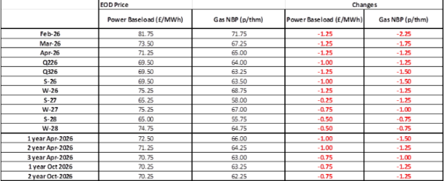 Gas: Gas prices fell yesterday. In the prompt, temperatures are expected to rise to an average of 6°C in weeks 3 and 4, slightly above the norm, limiting heating demand. Ample supplies of LNG continue to be imported in the UK.