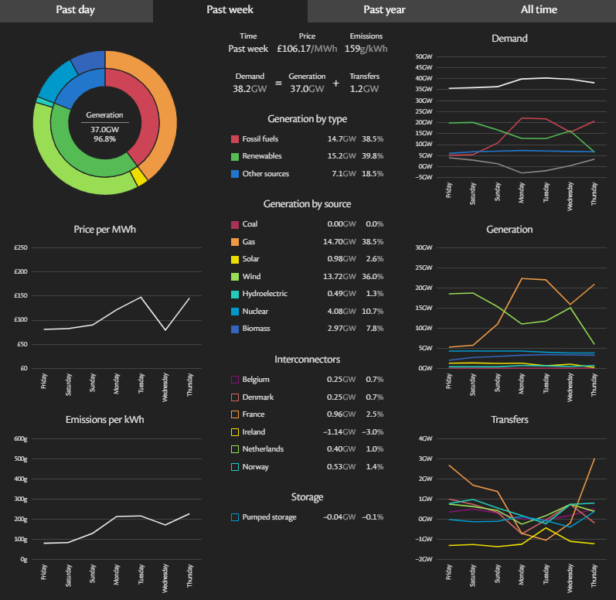 On the generation side the past week saw the generation cost at the highest level we’ve seen in the last few years at £106.17/MWh, driven by fossil fuels at 38.5% of total generation. To get that in context, over the last year the average price has been £79.66/MWh. Interestingly renewables were at 39.8%, with wind producing 36% of that.